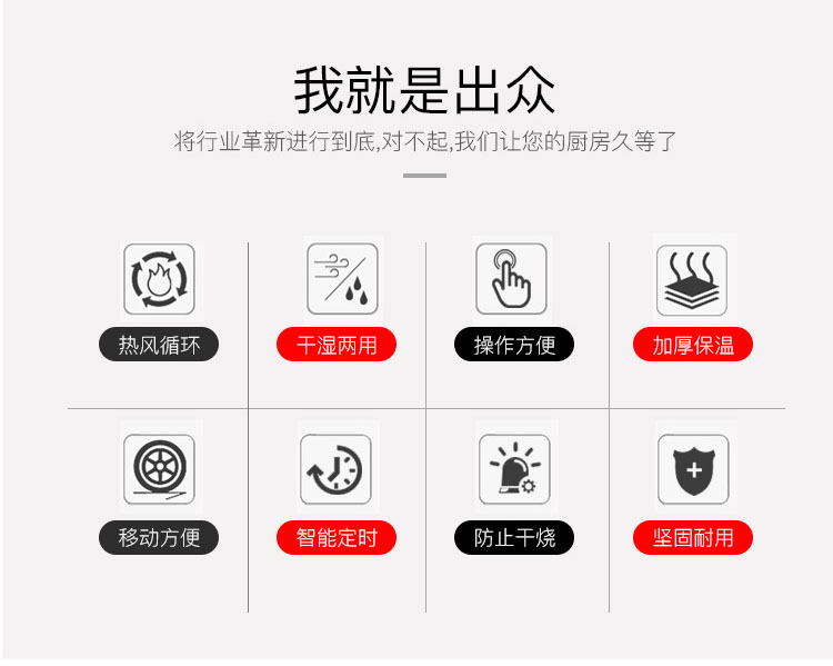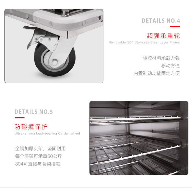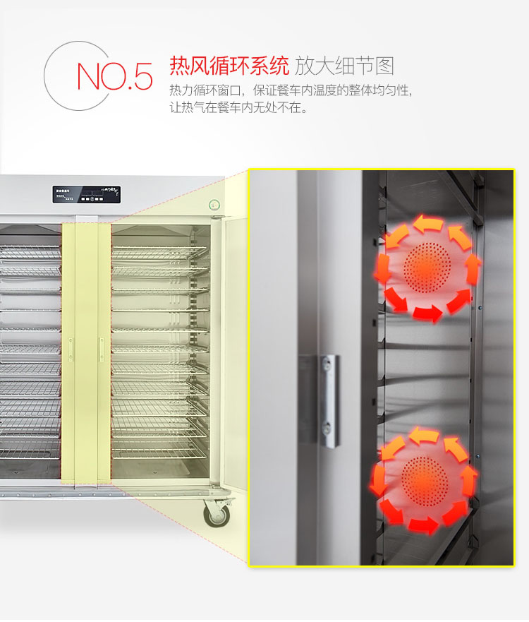 風(fēng)熱風(fēng)循環(huán)加熱系統(tǒng),柜內(nèi)加熱快速均勻,全聚氨酯微孔發(fā)泡保溫層保溫效果更佳,推車式設(shè)計(jì)便于移動(dòng),適合醫(yī)院病房送餐、酒店上菜送餐。