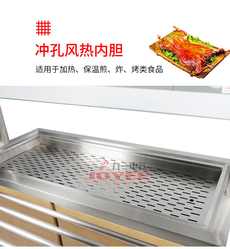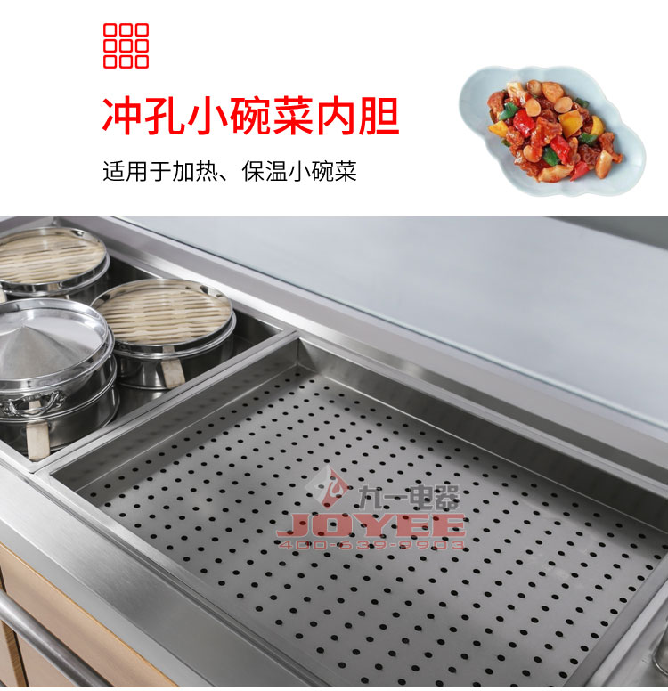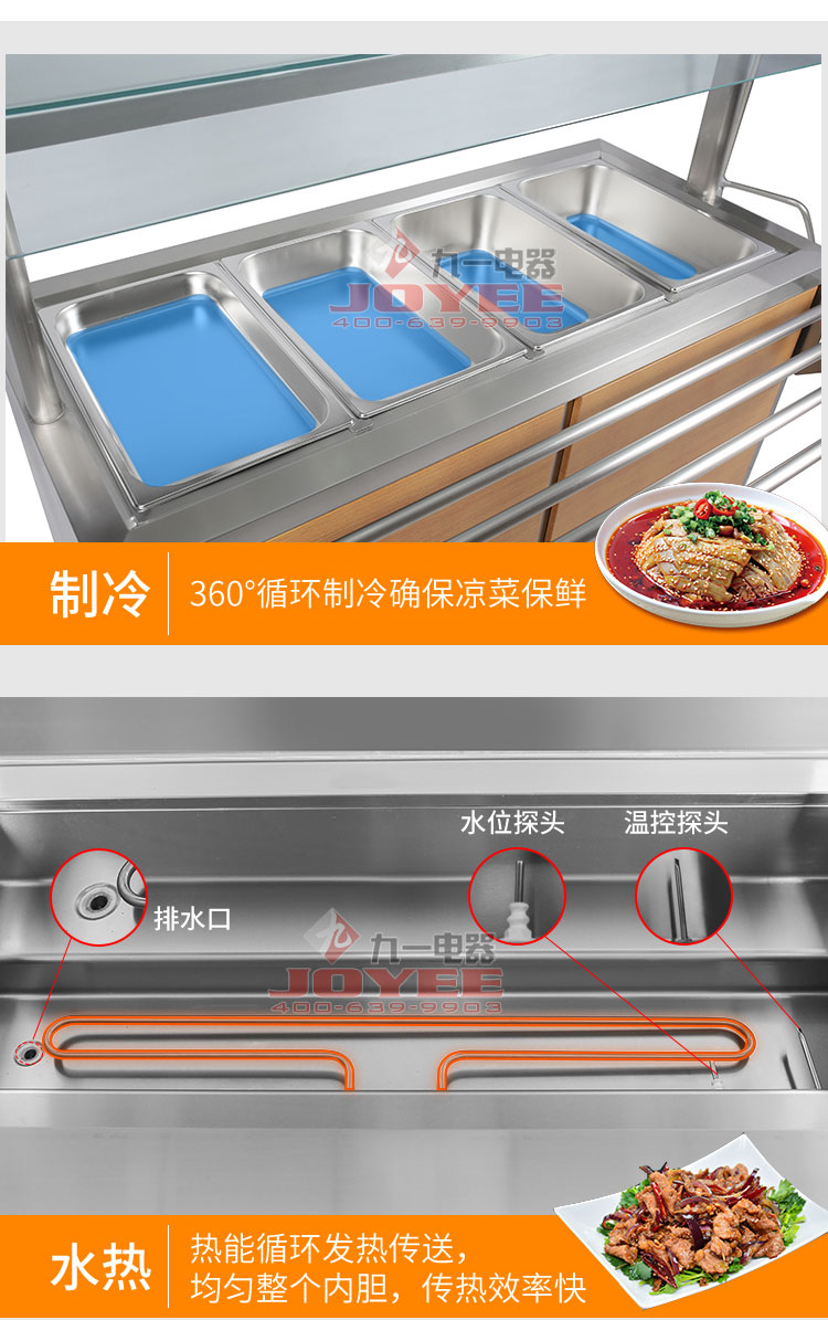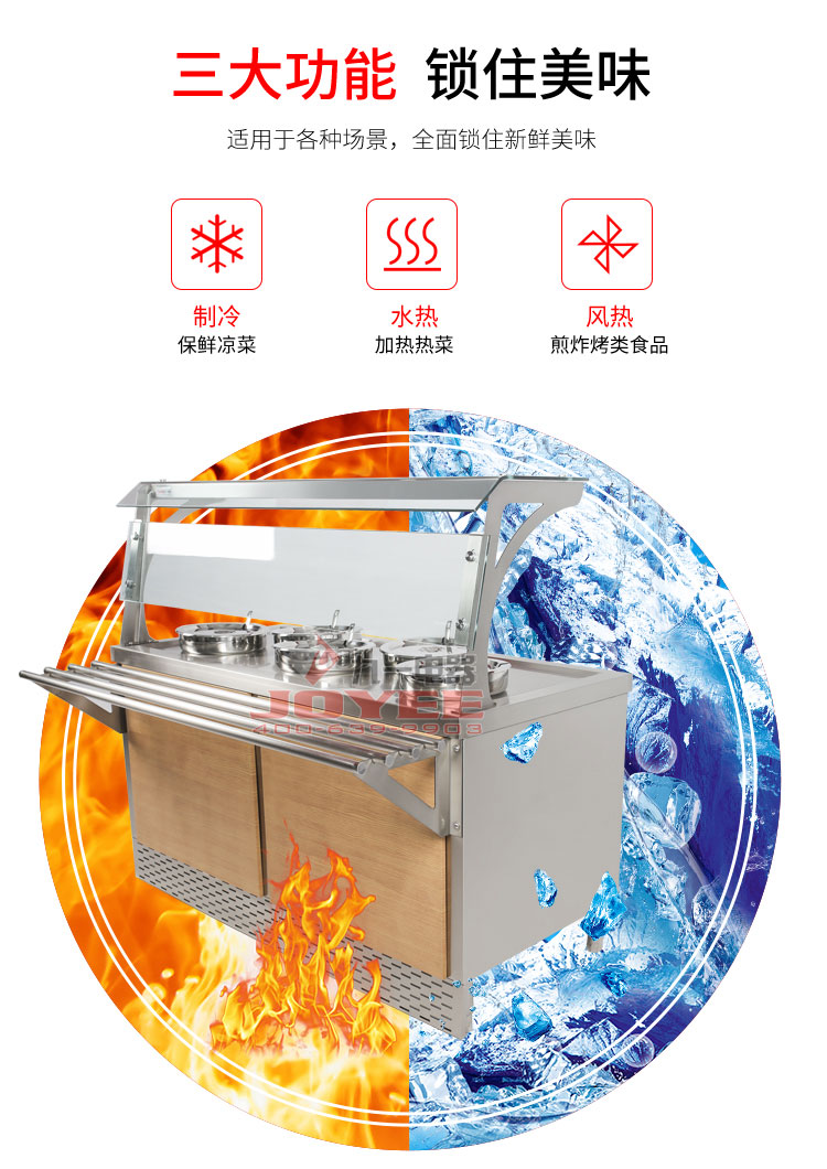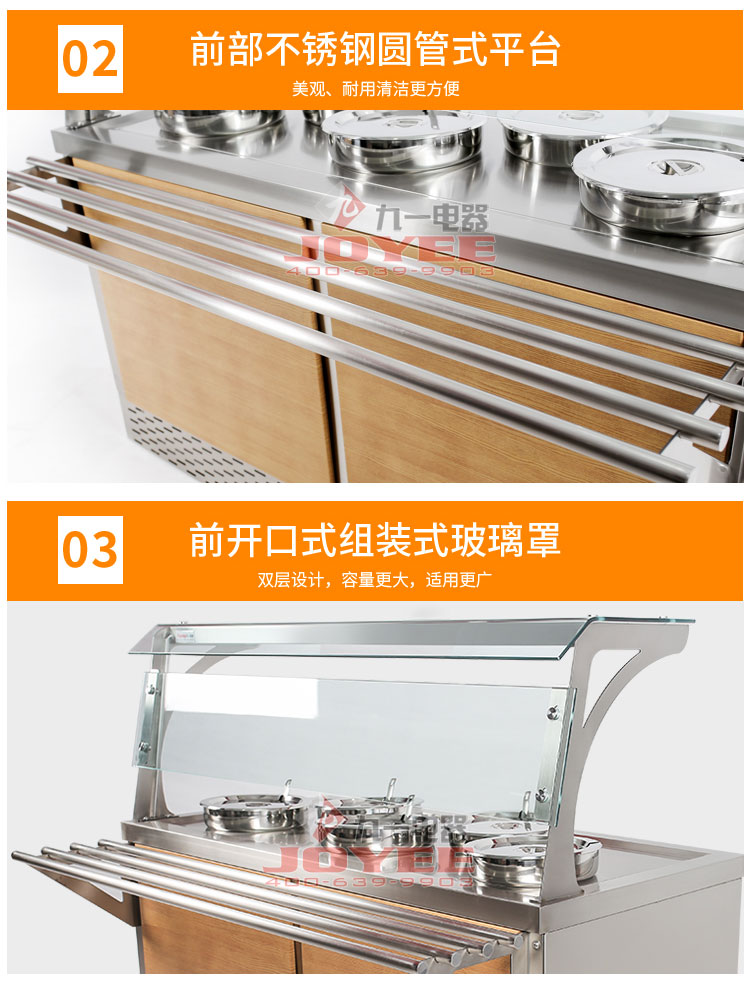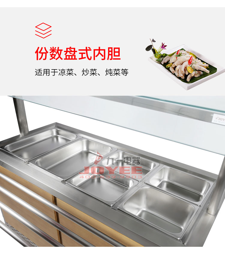 仿木紋裝飾板高端上檔次,前部圓管式平臺簡潔大方,前開口式玻璃罩方便傳遞菜品,內置LED射燈展示效果更佳,全304不銹鋼柜體,厚度1.2mm板材鍛造堅固耐用!