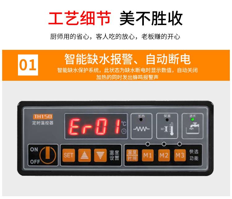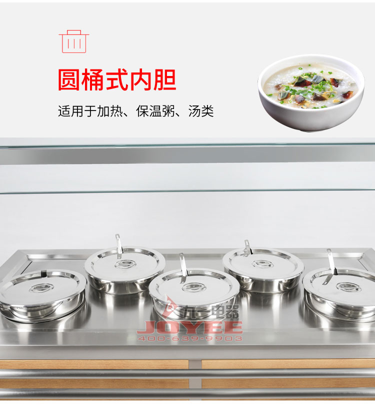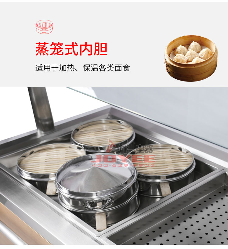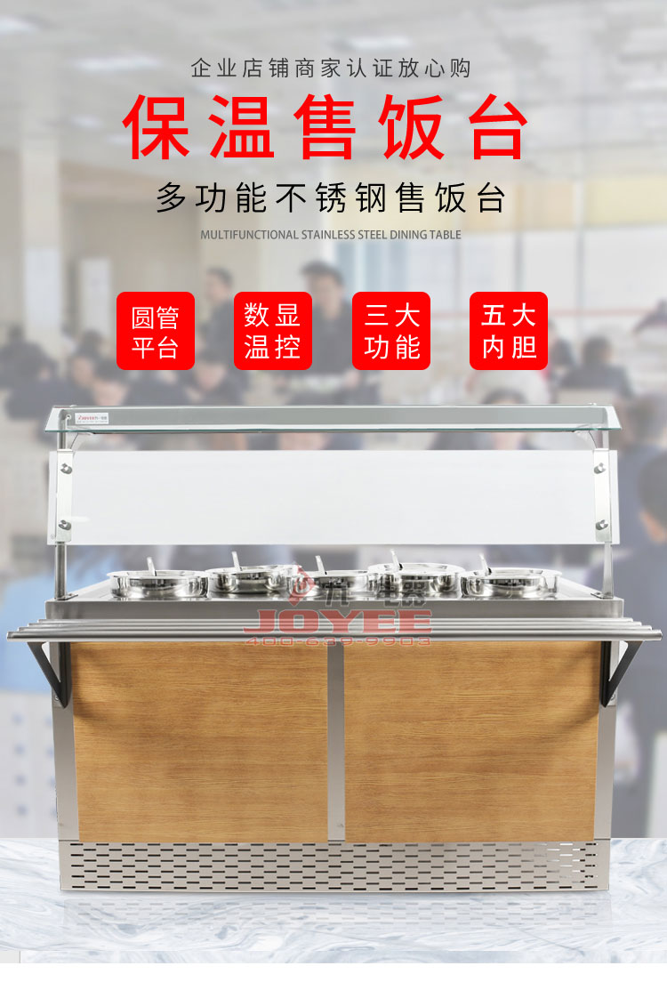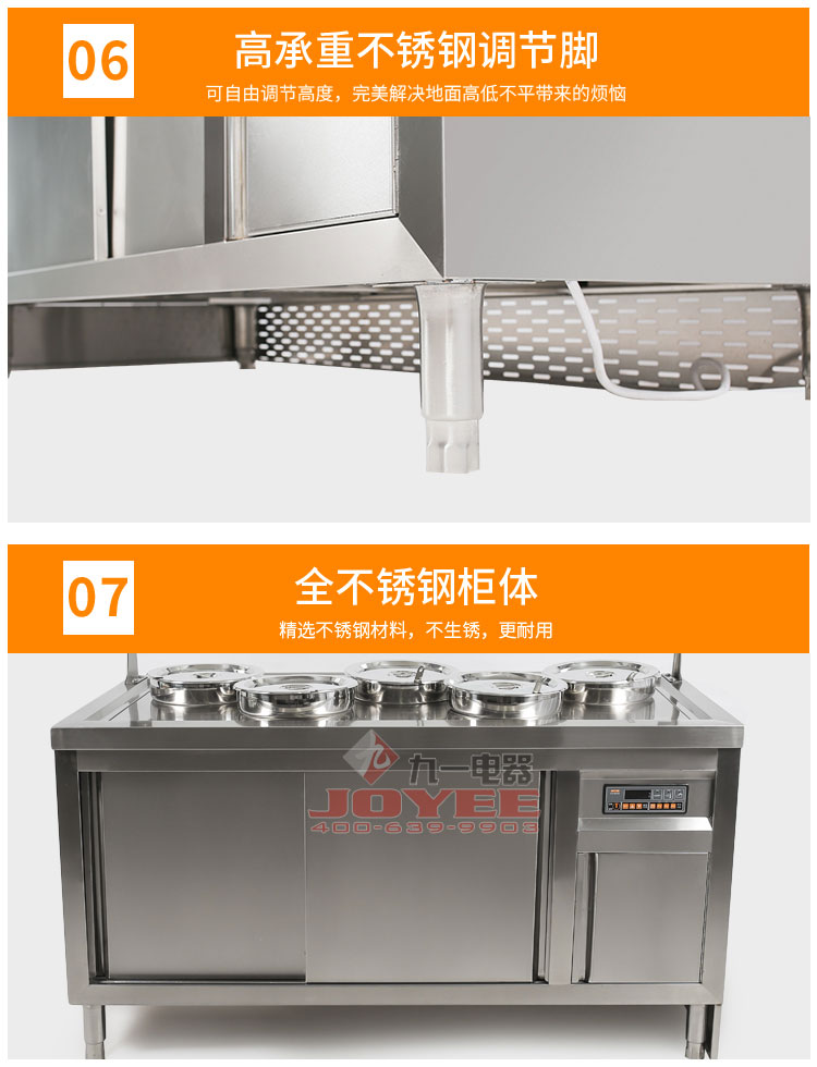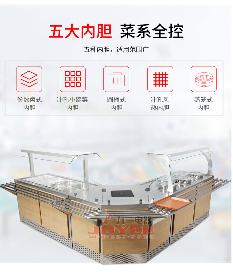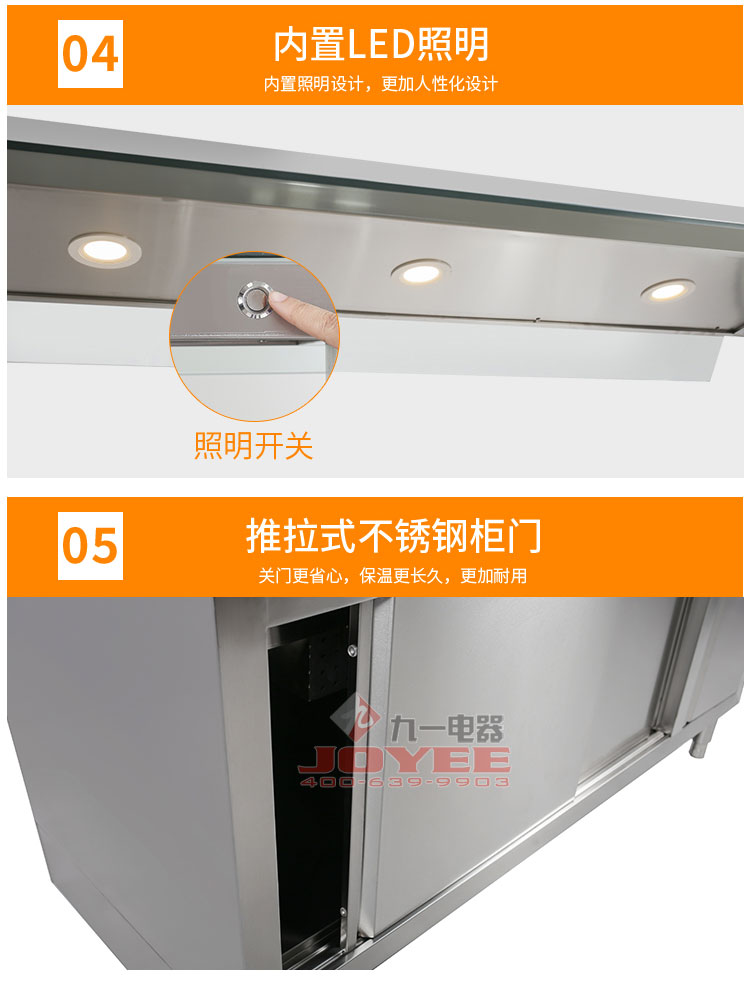 仿木紋裝飾板高端上檔次,前部圓管式平臺簡潔大方,前開口式玻璃罩方便傳遞菜品,內置LED射燈展示效果更佳,全304不銹鋼柜體,厚度1.2mm板材鍛造堅固耐用!