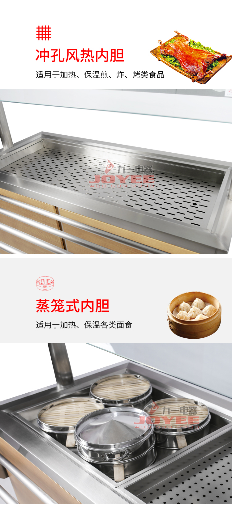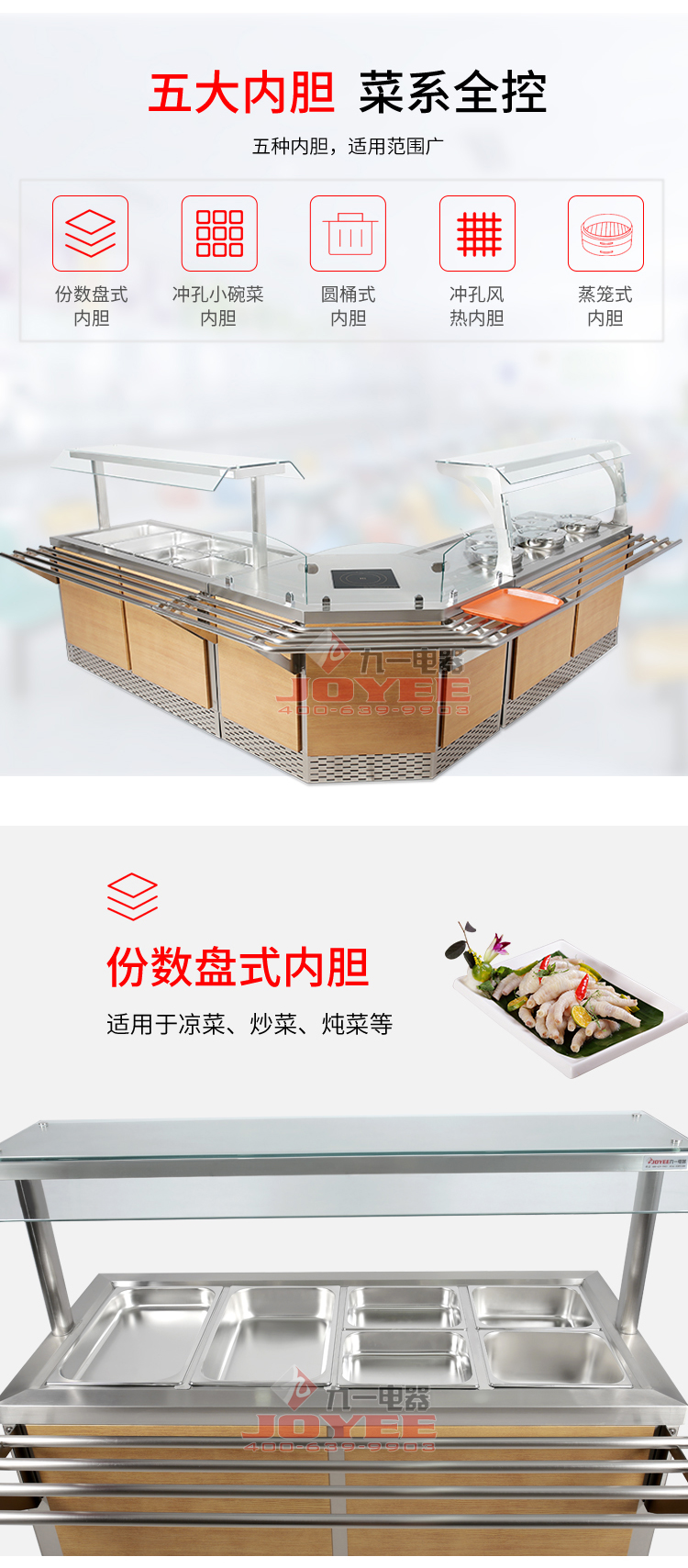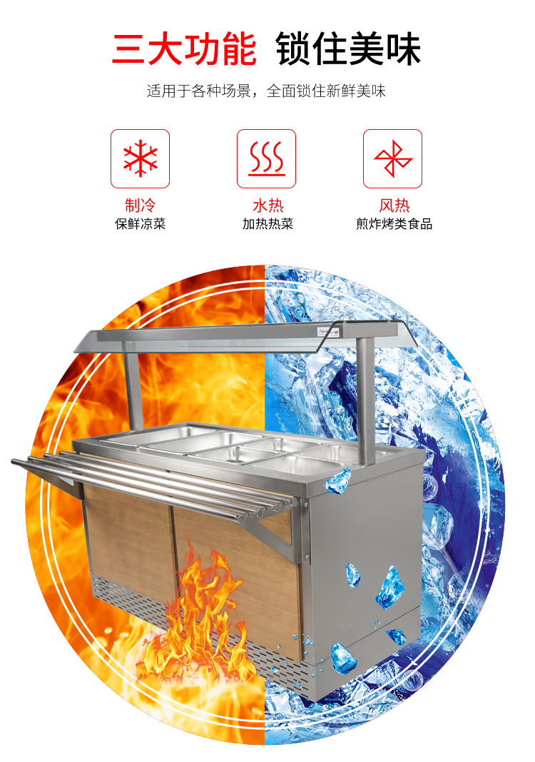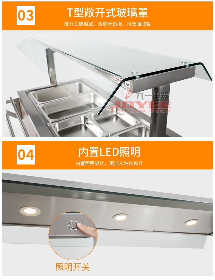 仿木紋裝飾板高端上檔次,前部圓管式平臺(tái)簡(jiǎn)潔大方,T型敞開(kāi)式玻璃罩適合自助餐,內(nèi)置LED射燈展示效果更佳,全304不銹鋼柜體,厚度1.2mm板材鍛造堅(jiān)固耐用!