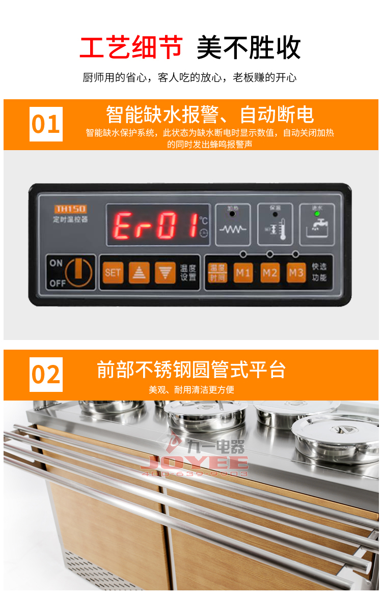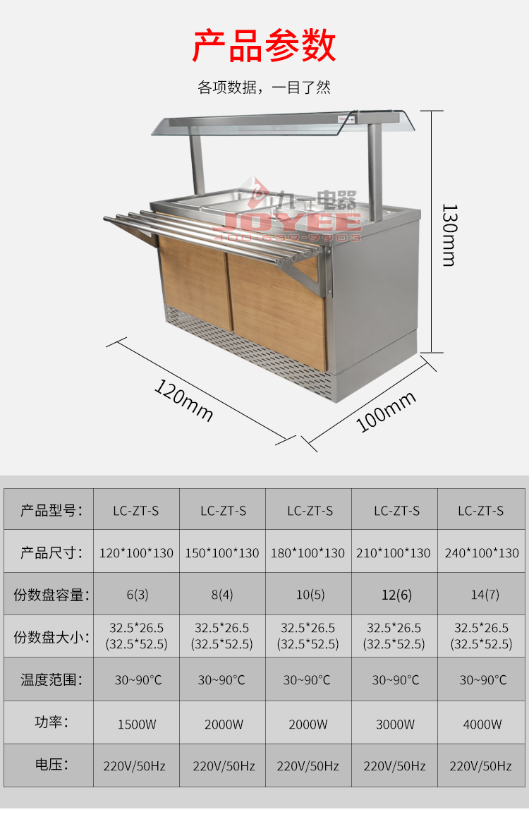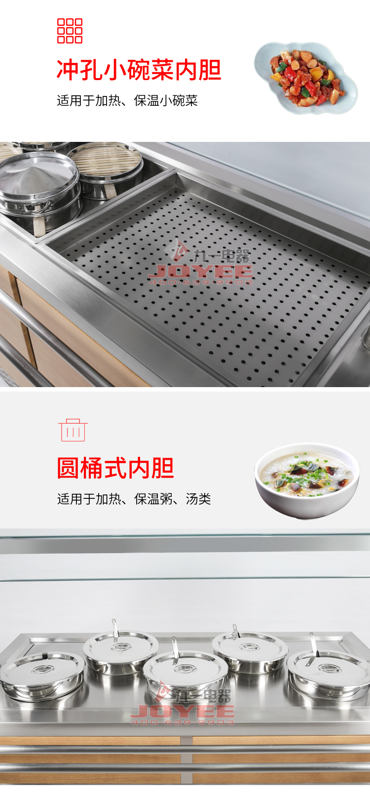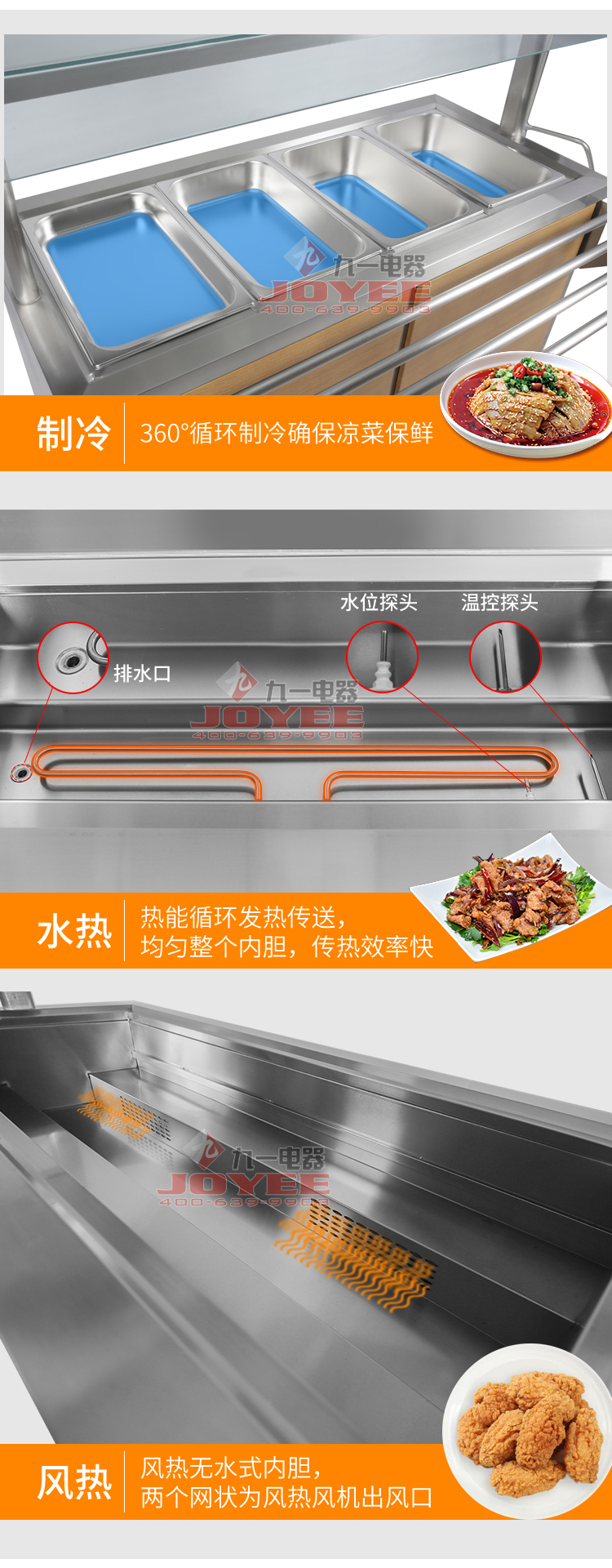 仿木紋裝飾板高端上檔次,前部圓管式平臺(tái)簡(jiǎn)潔大方,T型敞開(kāi)式玻璃罩適合自助餐,內(nèi)置LED射燈展示效果更佳,全304不銹鋼柜體,厚度1.2mm板材鍛造堅(jiān)固耐用!