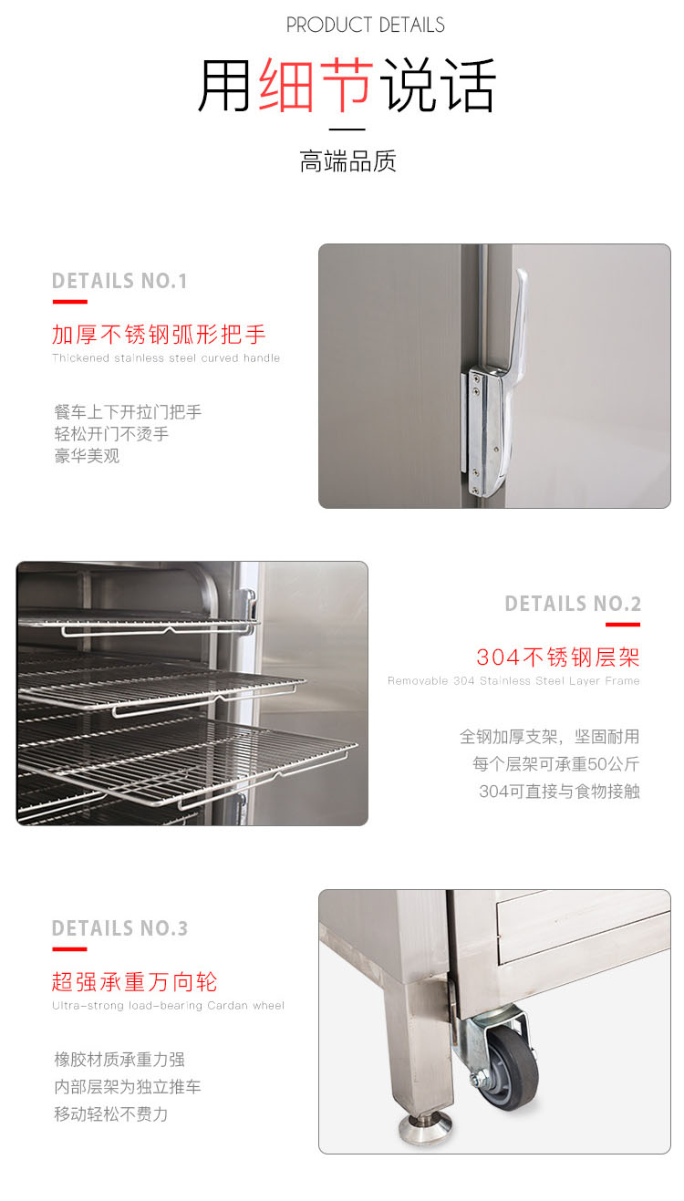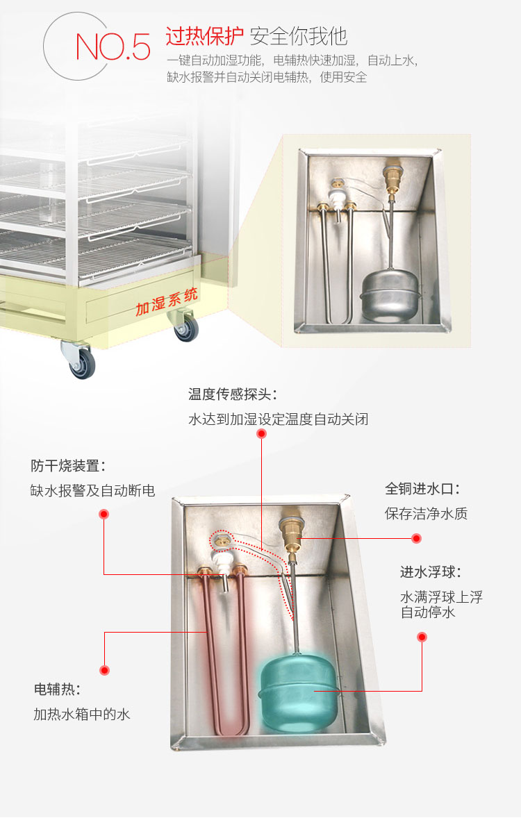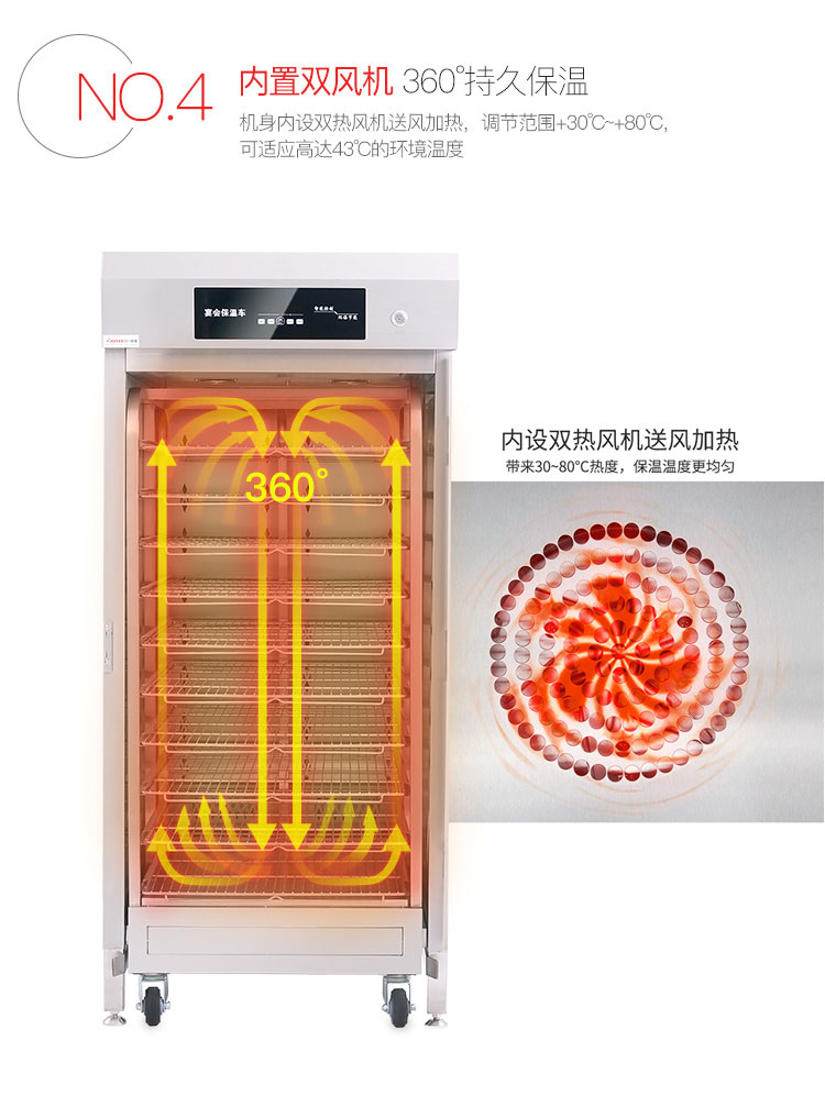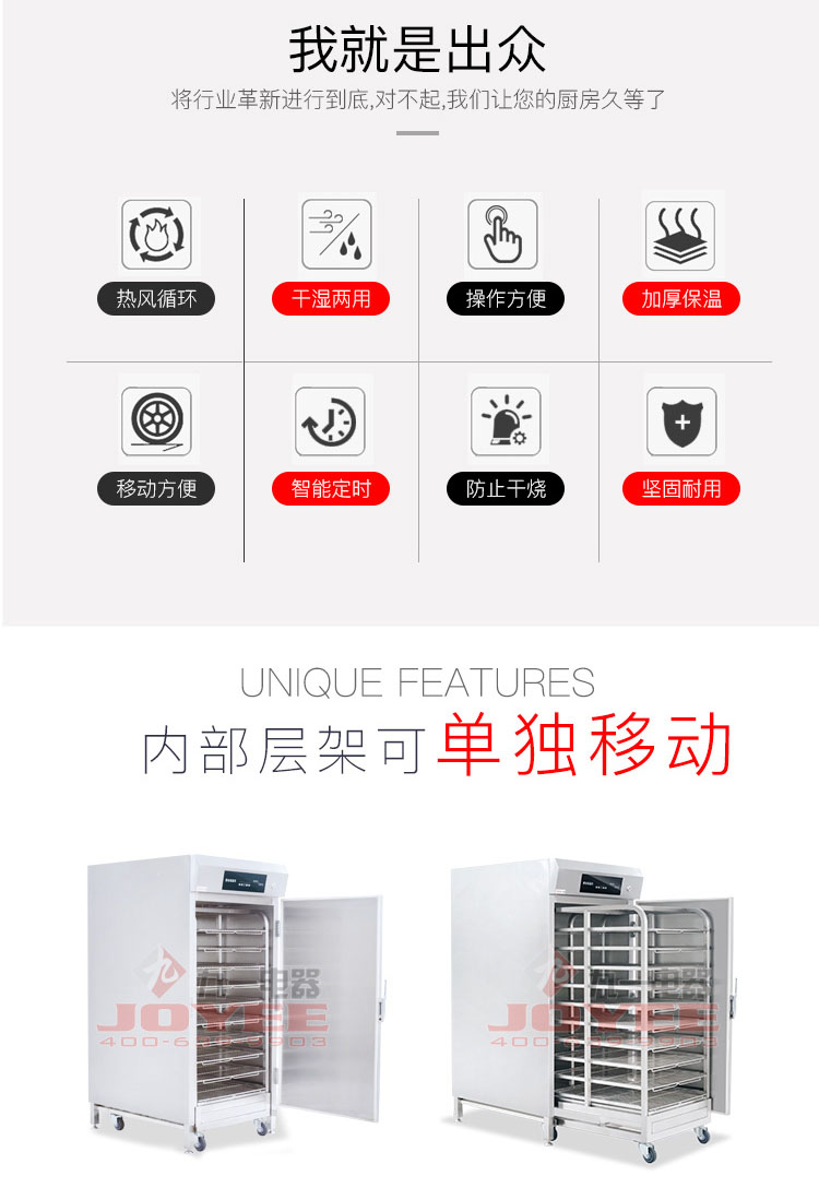 內(nèi)部層架為獨(dú)立小車模式可整體推出,這樣大大加快了上菜速度,內(nèi)熱風(fēng)循環(huán)加熱系統(tǒng)加熱快速均勻,內(nèi)置電熱加濕系統(tǒng)滿足濕度需求。